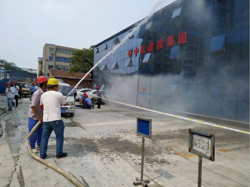 演练模拟项目部某处发生火灾。15:00,消防警报拉响,通讯组发现火情后,立即上报领导,同时,边启动消防应急疏散预案边迅速拨打“119”报警。救护组、抢险组、警戒组等成员按照分工,有条不紊地切断非消防电源、启动消防泵、疏散楼内职工。