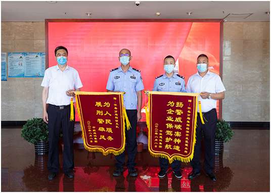 培训中心主任孔德明代表恒峰g22官方网站-恒峰(中国)向怀柔分局雁栖经济开发区派出所所长和怀柔分局刑侦支队支队长送上锦旗,代表公司感谢人民警察服务企业生产建设、守护一方平安付出的艰辛努力,感谢怀柔分局雁栖开发区派出所和怀柔分局刑侦支队急企业所急、想人民所想,在企业遇到困难时及时出警,有力保障了企业财产安全,维护了社会良好秩序,为企业发展创造了平安和谐的营商环境。