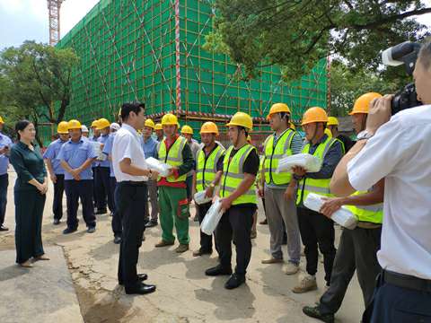 8月21日上午十一点,接近中午烈日炎炎,湘江集团党委书记、董事长张利刚一行来到恒峰g22官方网站-恒峰(中国)承建的长沙科技创意园项目,现场看望慰问高温天气下依然坚守战斗在岗位上的广大建设者,为大家送来了冰箱、电风扇、凉茶、藿香正气水、夏桑菊、西瓜等防暑降温用品。